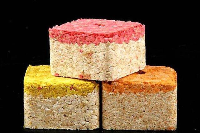 诱钓原理:这些添加剂吸附在饵料的外层部分,可以快速的溶解进水里起到诱鱼的作用;里面没有添加剂的部分,反而常见是大鱼适口性的保证。进一步,还可以分层压制,出来“双色” “多色”的饵饼,原理是一样的。当然,笔者个人使用的,都是不加色素的。