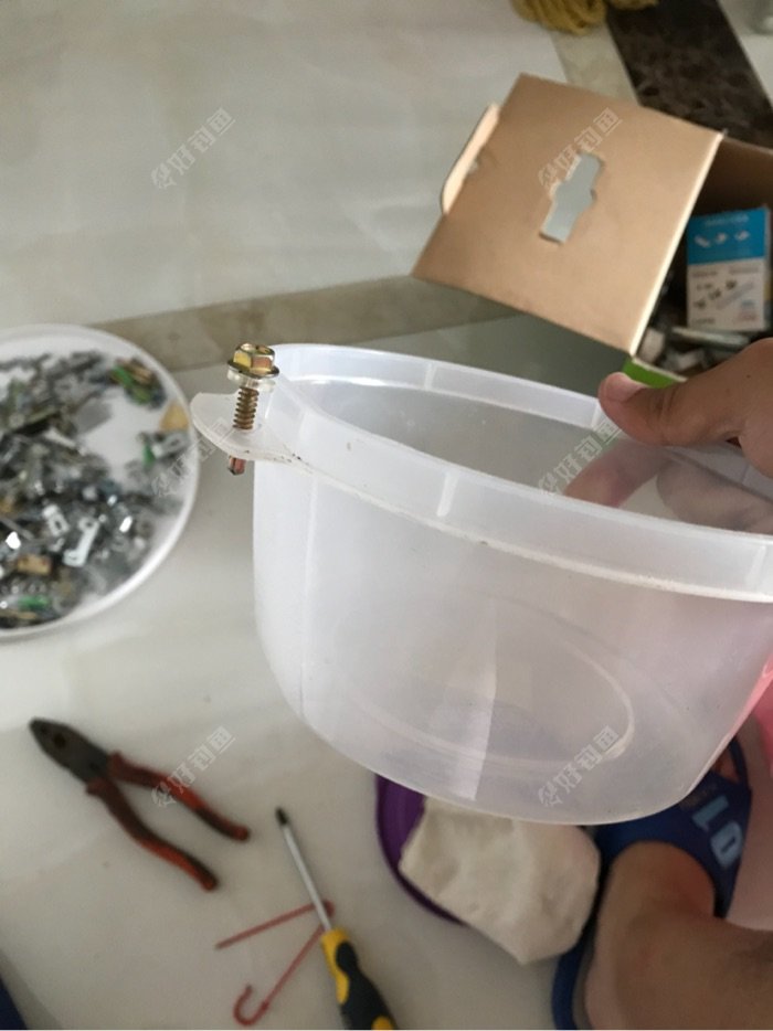 从网上花了二十多块钱买的钓箱配件,炮台,鱼护,饵料架,比好位置做上记号准备上螺丝