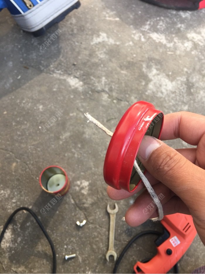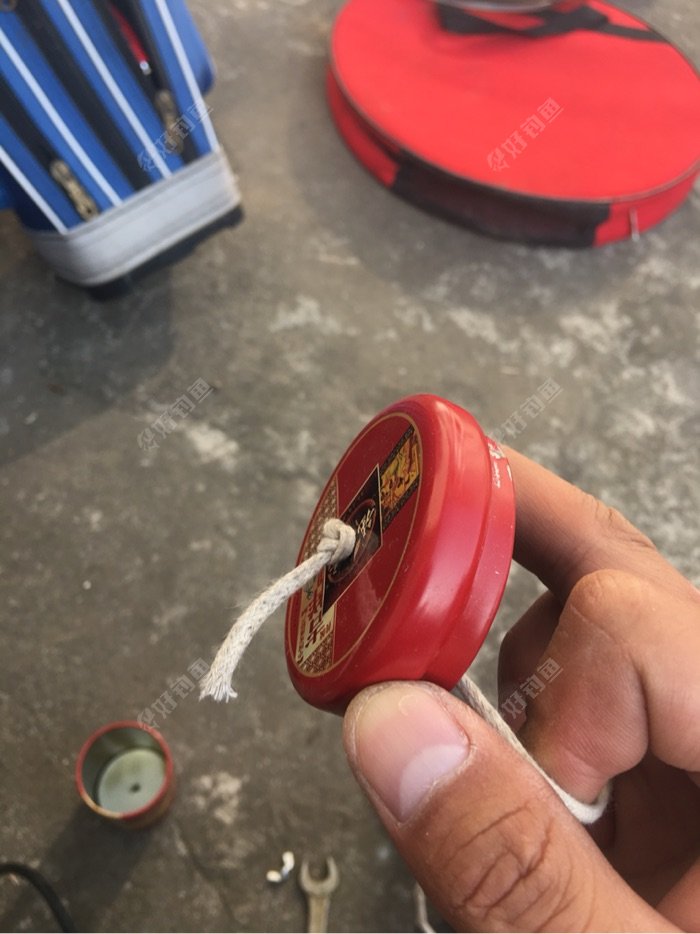 将一根大立马线绑在罐盖内侧的一头固定,如图