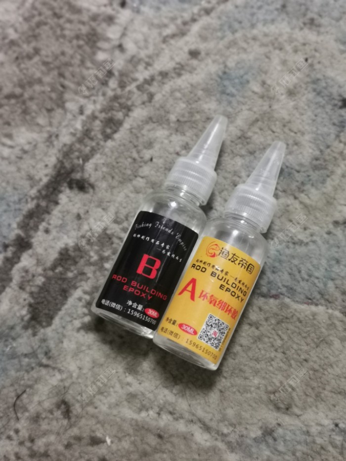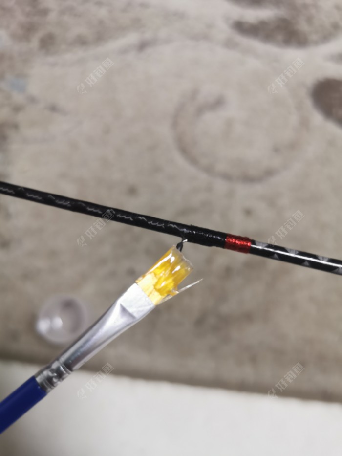将胶水按1:1的比例调好,用专用的笔进行涂抹,一边涂,一边转动鱼竿。