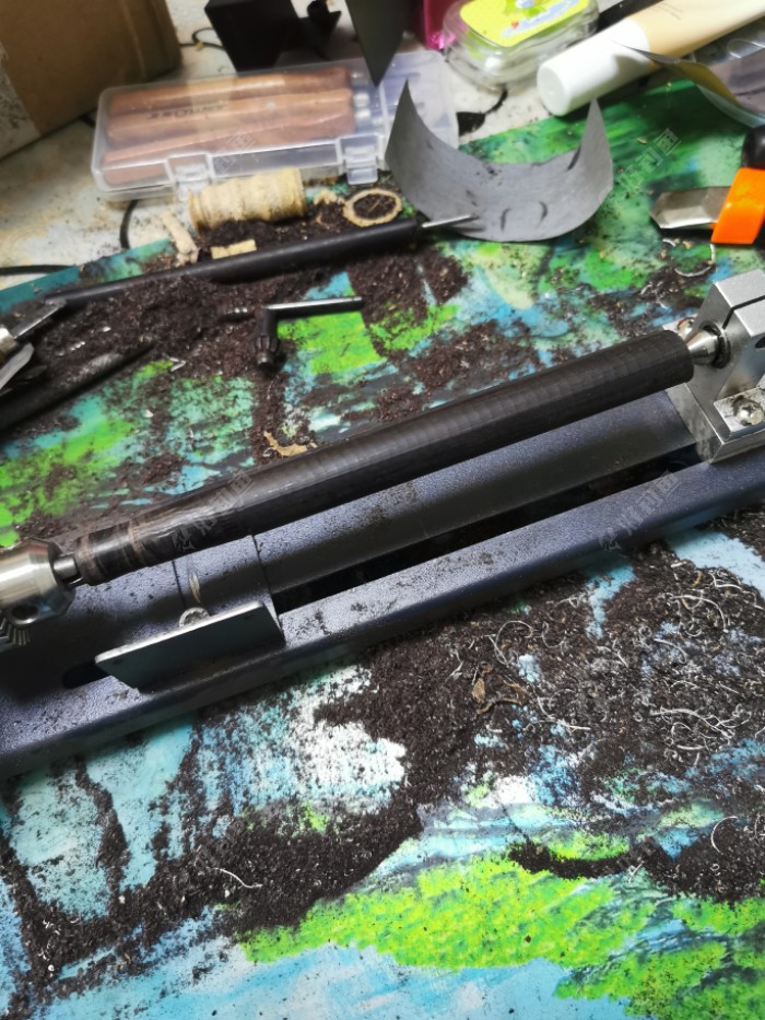 因为我买的是1.98米的L调的交叉碳布到顶的竿胚,准备做成2.2米的杆子(找遍了某宝也没找到2米以上L调的交叉碳布到顶的竿胚),所以就要在手把节再加上20厘米的一节。我依然用檀木做。