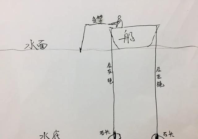 钓点选好后,接下来就要进行船只的定位工作了,具体的操作是:用尼龙绳把石头或者重物捆绑栓牢,分别在船只的两头将石头沉入水底,具体沉入两块还是四块石头或重物根据水流和风力而定,石头或重物落底后,将尼龙绳垂直绷紧分别在船上栓牢,这样就可有效的避免船只的漂移。