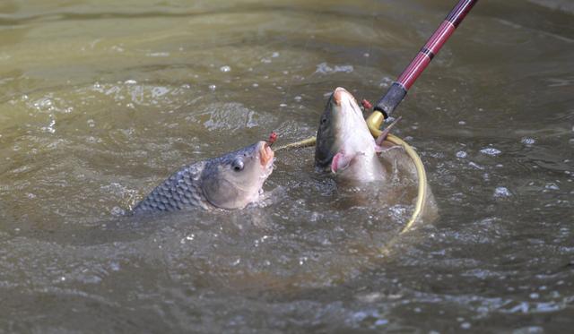 其次,在遛鱼时不要先把抄网放进水里,因为鱼看到抄网就会垂死挣扎,此时我们一手抄网,一手鱼竿,不容易控鱼。正确的方法是耐心遛鱼,一直等到鱼彻底没了力气,翻白浮到水面后,再拿抄网抄起。